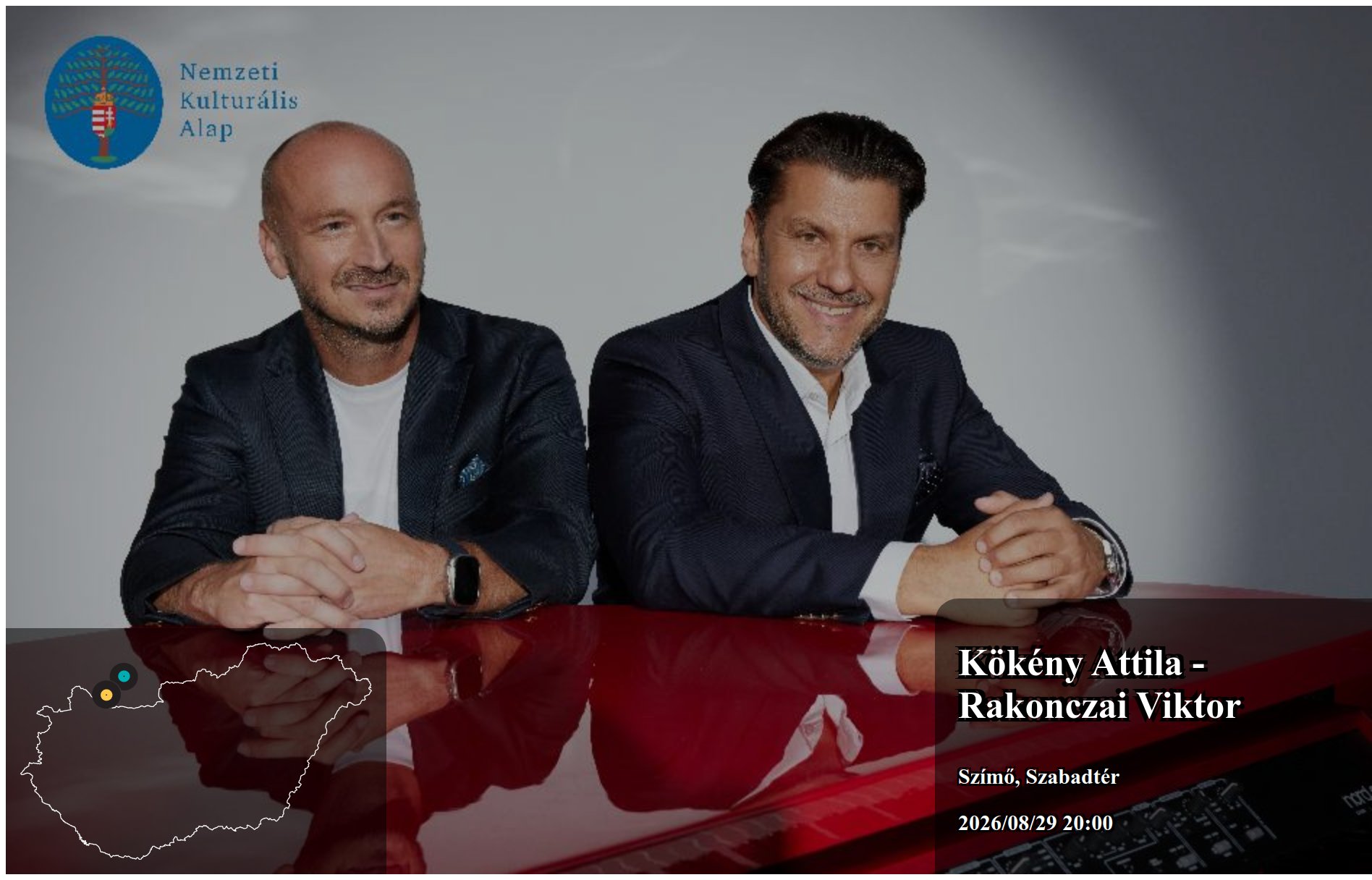 2026/08/29 20:00 kezdettel Kökény Attila - Rakonczai Viktor fellépése Szímő településen Szabadtér helyszínen kerül megrendezésre. Az esemény Nyilvános ingyenes rendezvény szabadtéren.